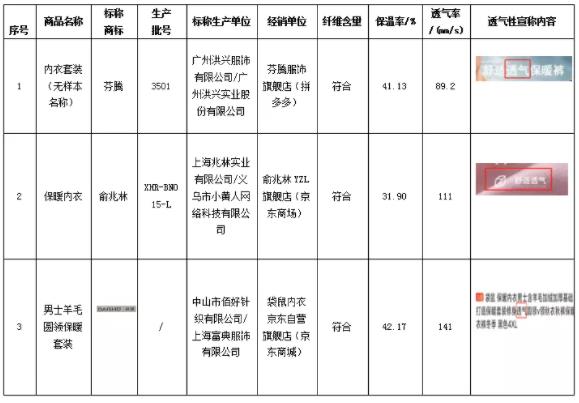 购自“拼多多”的标称商标为“芬腾”内衣套装(无样本名称)样品、购自“京东商城”的标称商标为“俞兆林”保暖内衣和“袋鼠”男士羊毛圆领保暖套装样品透气率实测分别为89.2mm/s、111mm/s、141mm/s,低于《针织保暖内衣》标准规定透气率应≥180mm/s的规定。