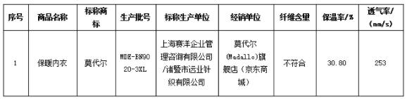 购自“京东商城”的标称商标为“莫代尔”保暖内衣样品纤维含量不符合明示执行标准。