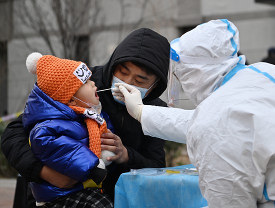 1月9日,在天津市西青区中北镇锦曦花苑社区一处核酸检测点,家长抱着孩子进行核酸检测。当日,天津市委市政府和市疫情防控领导小组、市疫情防控指挥部在全市范围开展全员核酸检测。