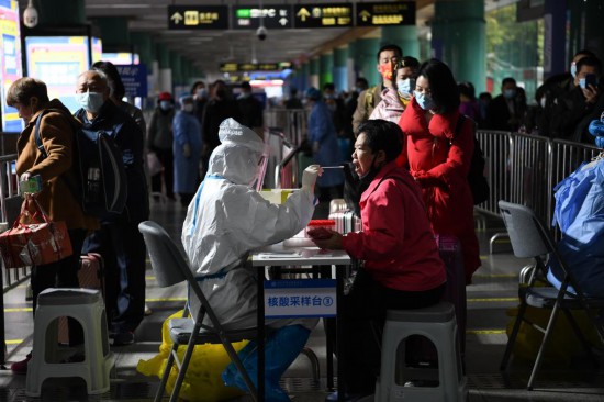 1月10日,在深圳火车站,抵深旅客进行核酸检测。(新华社记者梁旭 摄)