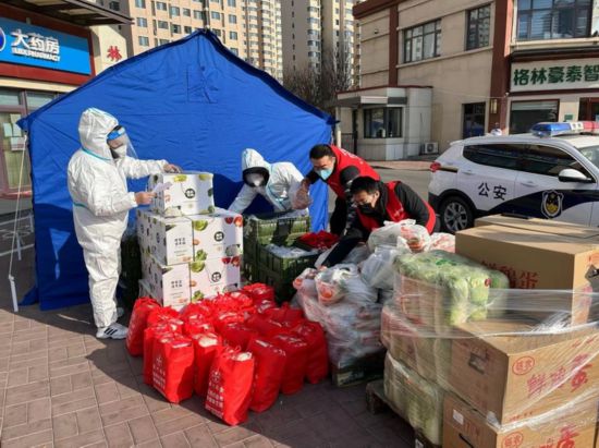 1月10日,在天津市津南区辛庄镇林锦花园附近,物美超市工作人员为居民运送生活物资。新华社 发