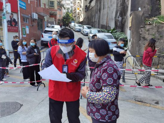 2022年1月8日,在深圳市龙岗区布吉街道布吉社区壹村东心岭,党员义工为居民提供服务。新华社发