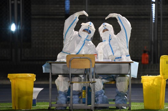 2022年1月10日凌晨,在天津市南开区鼓楼街道中营小学核酸检测点,两名医务人员做出“比心”手势。新华社记者 孙凡越 摄