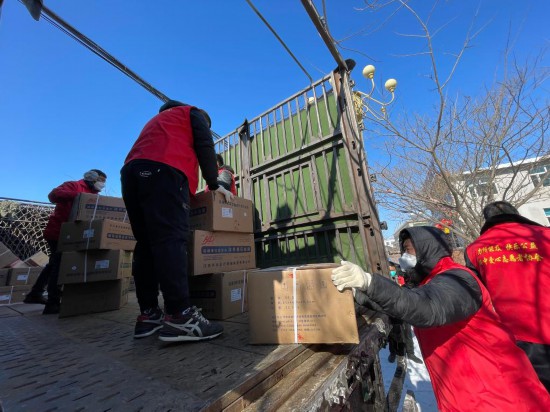 2月15日,在绥中县的一处物资储备点,志愿者们在搬运防疫物资。新华社记者李昂 摄