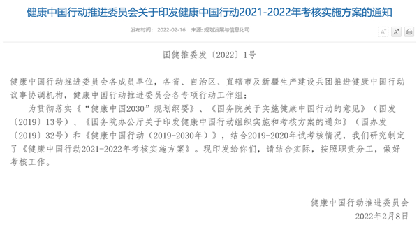 国家卫健委发布健康中国行动2021-2022年考核实施方案 将从五维度进行考核