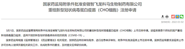 人民网北京3月2日电 (记者孙红丽)据国家药监局官网消息,3月1日,国家药品监督管理局附条件批准安徽智飞龙科马生物制药有限公司的重组新型冠状病毒蛋白疫苗(CHO细胞)上市注册申请。该疫苗是首个获批的国产重组新冠病毒蛋白疫苗,适用于预防新型冠状病毒感染所致的疾病(COVID-19)。