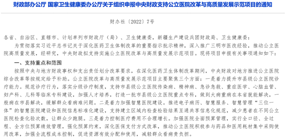 两部门:中央财政拟支持实施公立医院改革与高质量发展示范项目