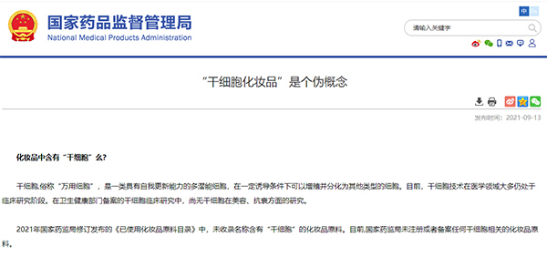 2021年9月,国家药监局在其官网发布科普文章《“干细胞化妆品”是个伪概念》