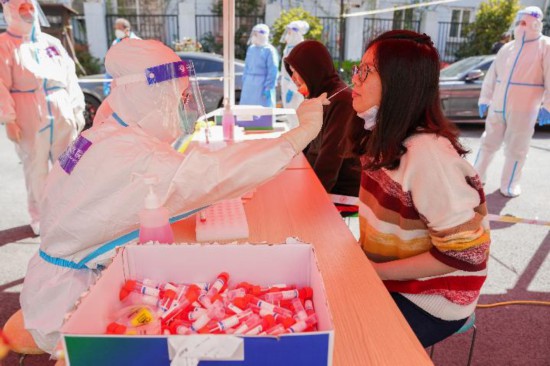 浦东新区东一居民区,江苏医疗队队员在为居民进行核酸检测。(新华社记者 丁汀摄)
