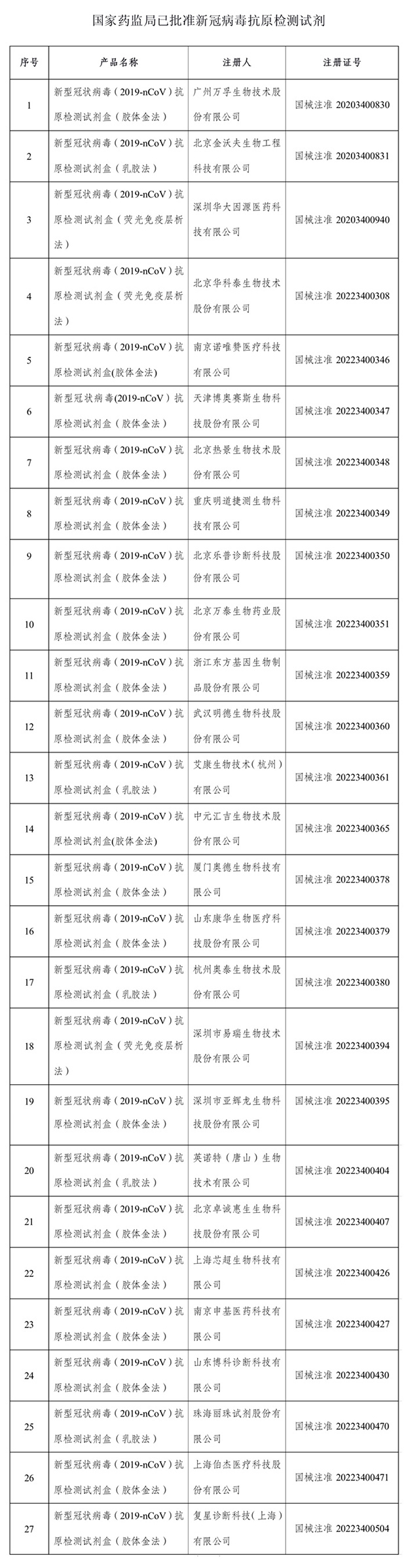 国家药监局已批准27个新冠病毒抗原检测试剂