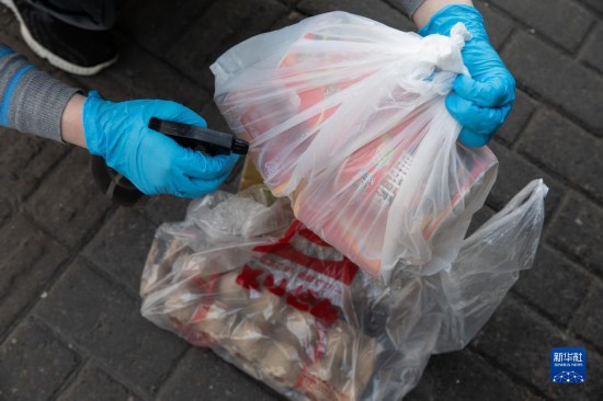 4月17日,在上海黄浦区豫园街道广福居民区,广福居委会工作人员对分装好的物资进行消毒处理。新华社记者 金立旺 摄