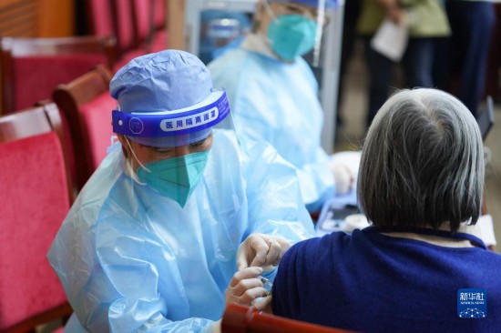 4月18日,医护人员在北京市东城区为老年人接种新冠疫苗。新华社记者鞠焕宗摄