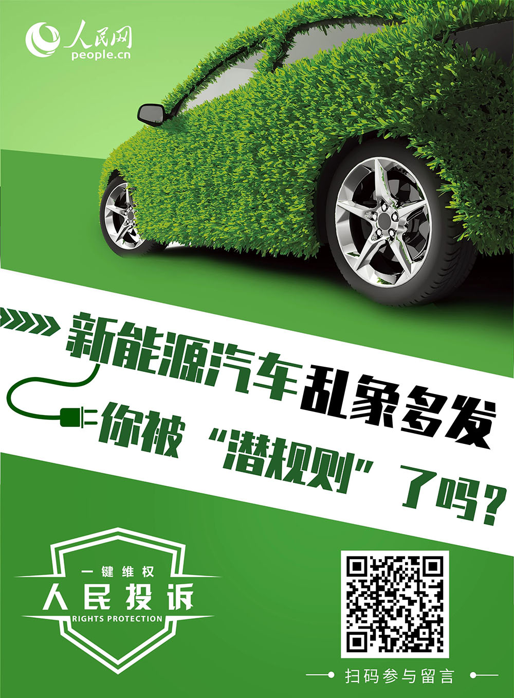 消费者在新能源汽车消费、使用过程中如何合理避坑呢?为助力广大消费者有效维权,督促厂商、经销商、4S店、车险机构等相关市场主体规范经营行为、完善服务保障,推动相关部门对侵权乱象加大监管和处罚力度,人民网“人民投诉”平台即日起征集相关维权线索,如果您遭遇此类权益侵害,如果您了解相关领域某些欺诈行为中不为人知的陷阱、黑幕,欢迎您扫码投诉、曝光。