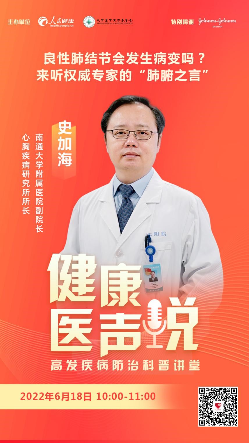 6月18日10:00,南通大学附属医院副院长、心胸疾病研究所所长史加海将作为首期嘉宾做客“人民好医生”客户端直播间,就肺结节相关问题与网友进行分享。