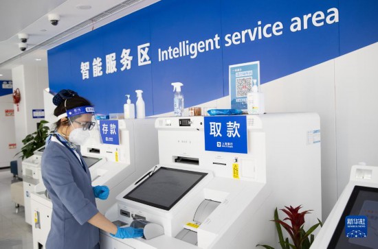 6月16日,在上海银行徐汇支行营业厅,工作人员在消杀取款机。根据防疫要求,银行自助机具使用从原来的双循环模式改为单循环模式,即存钱机具和取钱机具分开,确保存取现金安全;同时,尽量做到“一户一消杀”,即每位客户办理完业务后,都对机具进行简单消杀处理。