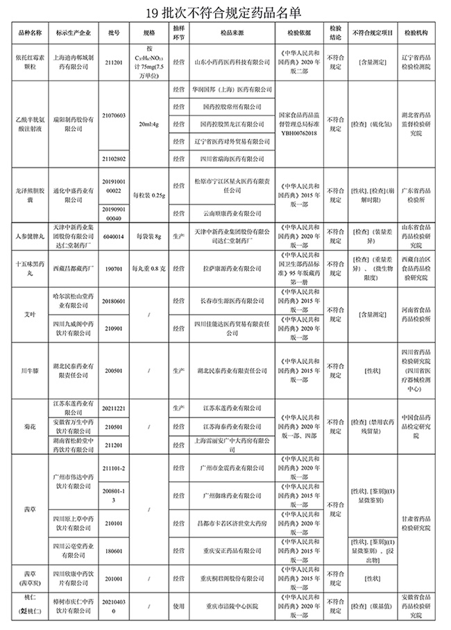 人民网北京7月14日电 (记者孙红丽)国家药监局今日发布通告,经湖北省药品监督检验研究院等10家药品检验机构检验,标示为瑞阳制药股份有限公司等16家企业生产的乙酰半胱氨酸注射液等19批次药品不符合规定。