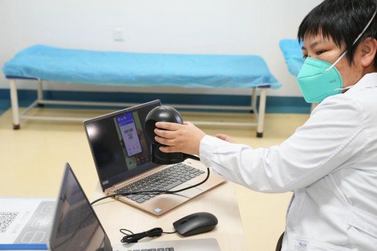 5月23日,在北京市丰台区卢沟桥社区卫生服务中心,医务工作者通过视频连线的方式为预约上门治疗的患者扫描电子医保卡。新华社记者 鞠焕宗 摄