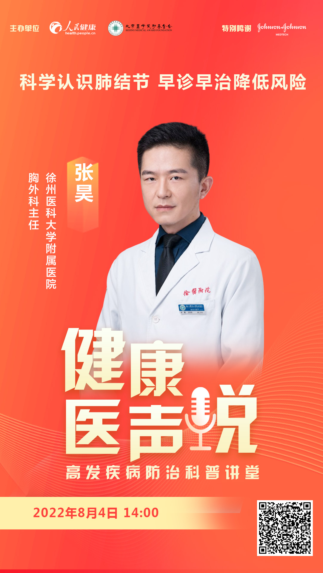 8月4日14:00,徐州医科大学附属医院胸外科主任张昊将做客直播间,就肺结节的相关问题与网友进行分享。