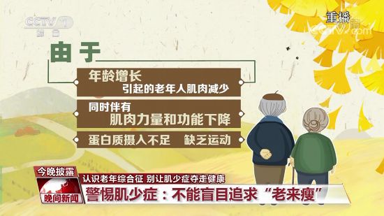 首都医科大学宣武医院老年医学科主任医师 马丽娜:俗话说千金难买老来瘦,其实这是我们老年人认识的一个误区,肌肉减少症它的危害是非常严重的,轻则可以引起骨折、跌倒,同时可能合并吞咽功能的障碍,容易发生误吸、感染,影响生命质量。
