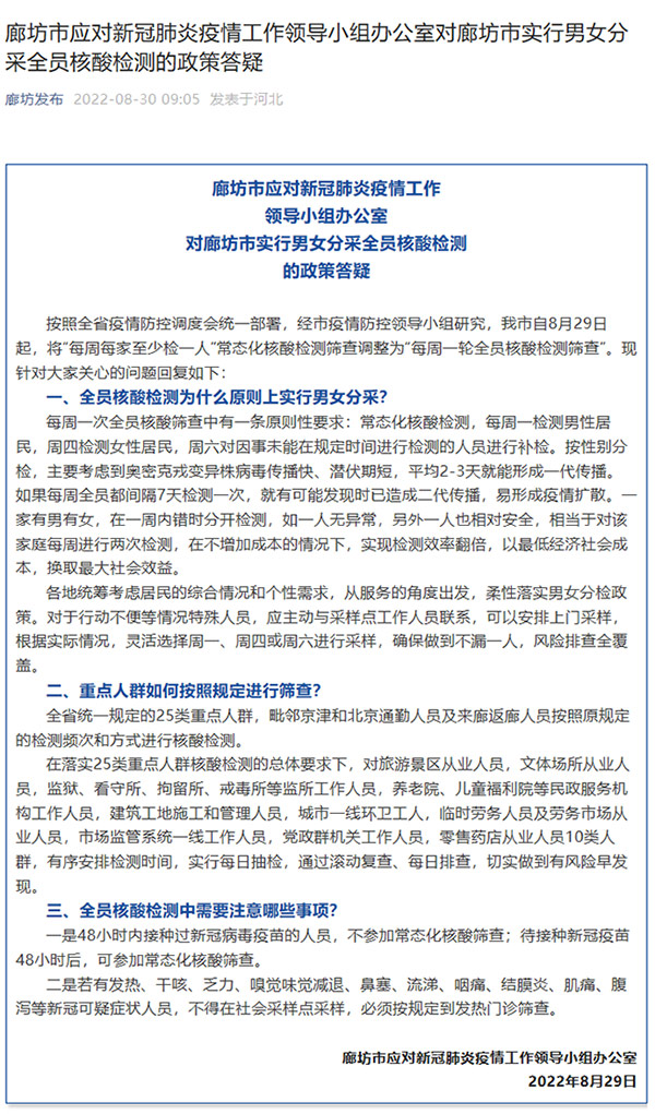 又一地实行全员核酸男女分采 廊坊官方发布政策答疑