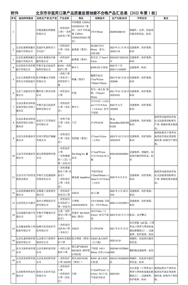 人民网北京9月5日电 (记者孙红丽)近日,北京市市场监督管理局公布的北京市非医用口罩产品质量监督抽查结果(2022年第1批)显示,标称商标为超事通(图形)、林中王、梓濠(图形)、仟倩等19组批产品不合格,存在的主要质量问题是过滤效率、防护效果等项目不符合标准要求,产品对颗粒物的滤除能力低,防护效果差。