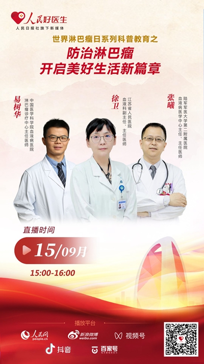 9月15日15:00-16:00,人民好医生客户端将邀请江苏省人民医院血液科副主任、主任医师徐卫,陆军军医大学第二附属医院血液病医学中心主任、主任医师张曦,中国医学科学院血液病医院淋巴瘤诊疗中心主任医师易树华共同做客演播室,与网友们一起聊一聊有关淋巴瘤的话题,解答上述疑问,欢迎收看。