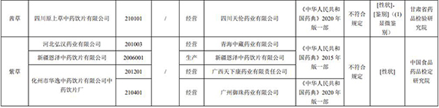 经中国食品药品检定研究院检验,标示为河北弘汉药业有限公司、新疆恩泽中药饮片有限公司和化州市华逸中药饮片有限公司中药饮片厂生产的4批次紫草不符合规定,不符合规定项目为性状。