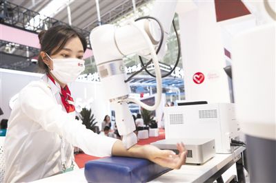 8月10日,在2022世界5G大会展厅里,参观者在体验5G网络支持下的5G远程医疗设备。新华社记者 张涛摄