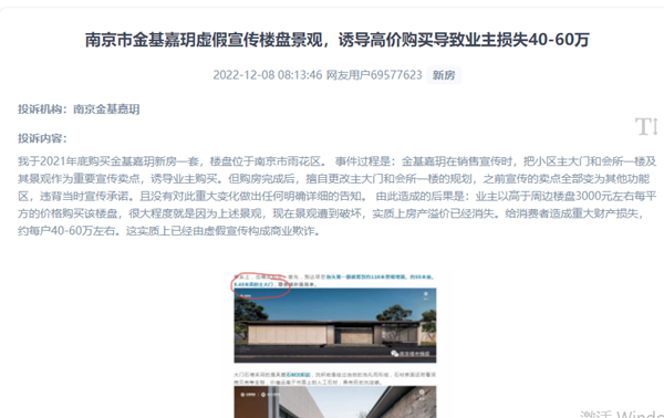 近日,来自南京的网友向“人民投诉”平台反映,南京某楼盘在销售时,将小区主大门和会所一楼及景观作为重要宣传卖点,以高于周边楼盘3000元左右每平方米的价格售卖,很多消费者都为了景观买单。但购房完成后,开发商擅自更改规划,之前宣传的卖点全部变为其他功能区,且未做任何明确告知。小区景观遭到破坏,实质上房产溢价已经消失,给消费者造成了重大财产损失。