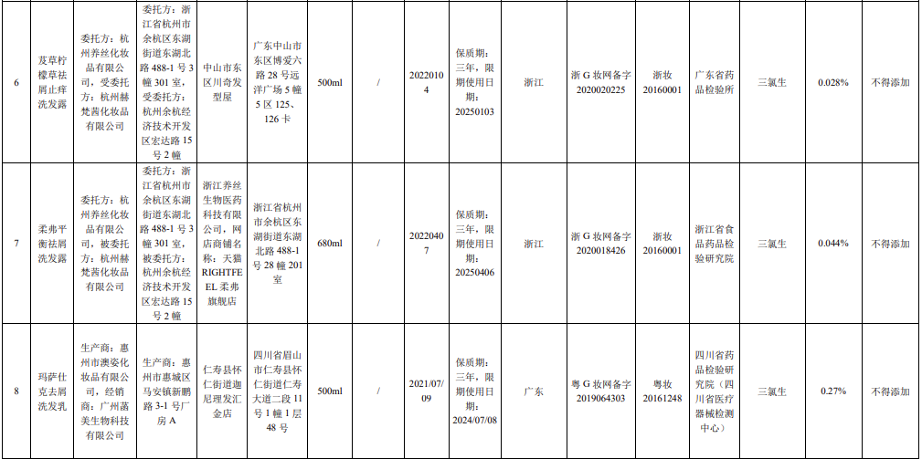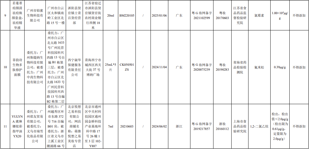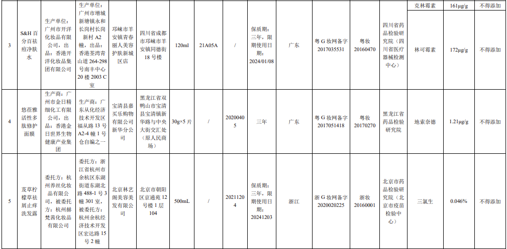 其中,标签标示为广州市开洋化妆品有限公司生产的S&H百分百祛痘净肤水被检出克林霉素和林可霉素;标签标示为广州市金日精细化工有限公司生产的悠莅雅活性多肽修护面膜被检出地索奈德;标签标示为惠州市澳姿化妆品有限公司生产的玛萨仕克去屑洗发乳被检出三氯生;标签标示为广州市铂蜜生物科技有限公司生产的若蔓蒂痘颜清祛痘焕颜套盒-祛痘精华液被检出氯霉素;标签标示为义乌市美黛化妆品有限公司生产的NUSVAN FOR AURORA水性不可撕拉指甲油-31薄荷奶绿被检出1,2-二氯乙烷。