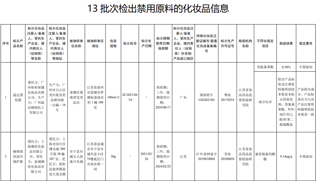 通告称,在2022年国家化妆品监督抽检工作中,经江苏省食品药品监督检验研究院检验,标签标示为委托方广州彰彩保健化妆品有限公司、生产方广州温达精细化工有限公司生产的温达黑发露等13批次化妆品,检出《化妆品安全技术规范(2015年版)》中规定的禁用原料。其中,上述标签标示名称为温达黑发露的产品检出禁用原料的同时,还存在产品成分比对不符合规定的问题。
