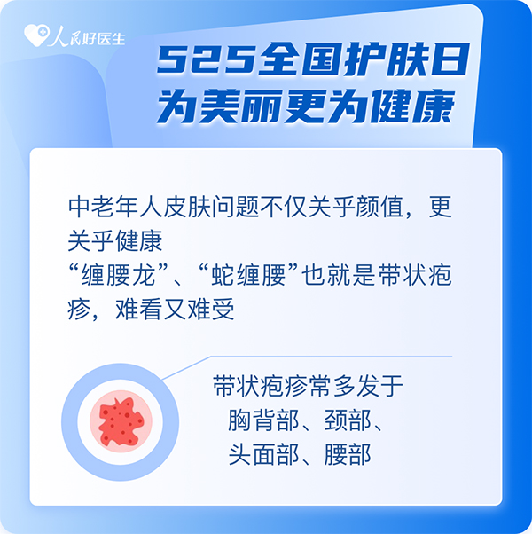 5月25日是全国护肤日,爱自己从爱护皮肤开始。而对于中老年人来说,皮肤问题不仅关乎颜值,更关乎健康。带状疱疹俗称“缠腰龙”,除了会出现红斑、丘疱疹、水疱等皮肤损伤症状外,还会伴随剧烈疼痛,严重影响了中老年人的身体健康和日常生活。