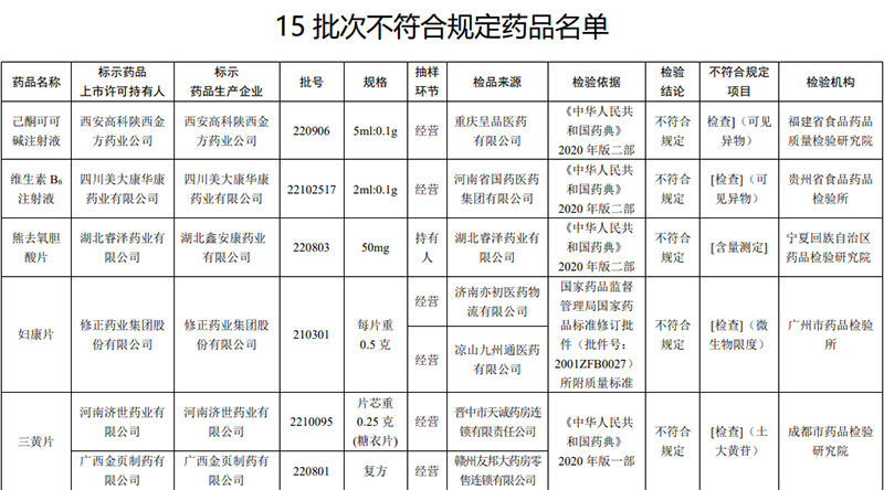 人民网北京6月21日电 (记者孙红丽)国家药监局近日发布通告,经广州市药品检验所等8家药品检验机构检验,标示为修正药业集团股份有限公司等15家企业生产的妇康片等15批次药品不符合规定。