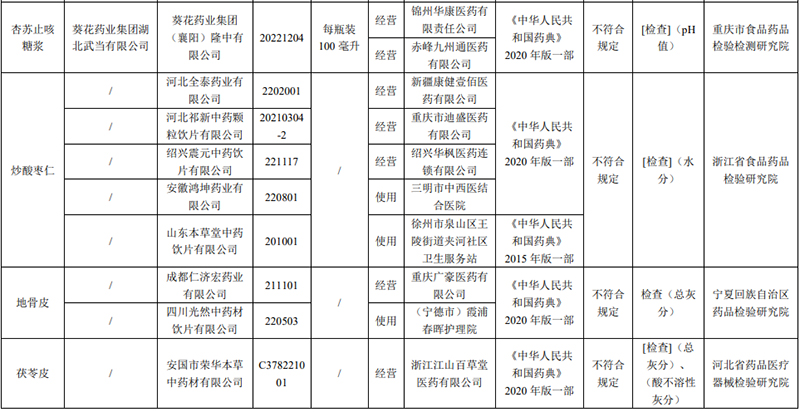 经宁夏回族自治区药品检验研究院检验,标示为成都仁济宏药业有限公司、四川光然中药材饮片有限公司生产的2批次地骨皮不符合规定,不符合规定项目为总灰分。