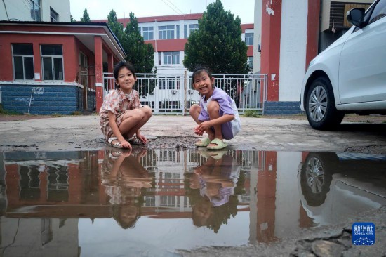 8月6日,在平原县王打卦镇,两名小朋友在水边玩耍。新华社记者 郭绪雷 摄