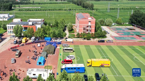 8月6日,在平原县王打卦中心小学,应急救援队伍集结待命(无人机照片)。新华社记者 郭绪雷 摄