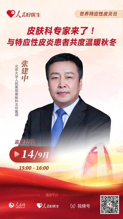 9月14日15:00,北京大学人民医院皮肤科主任医师张建中将做客直播间,就特应性皮炎等相关问题进行交流分享。