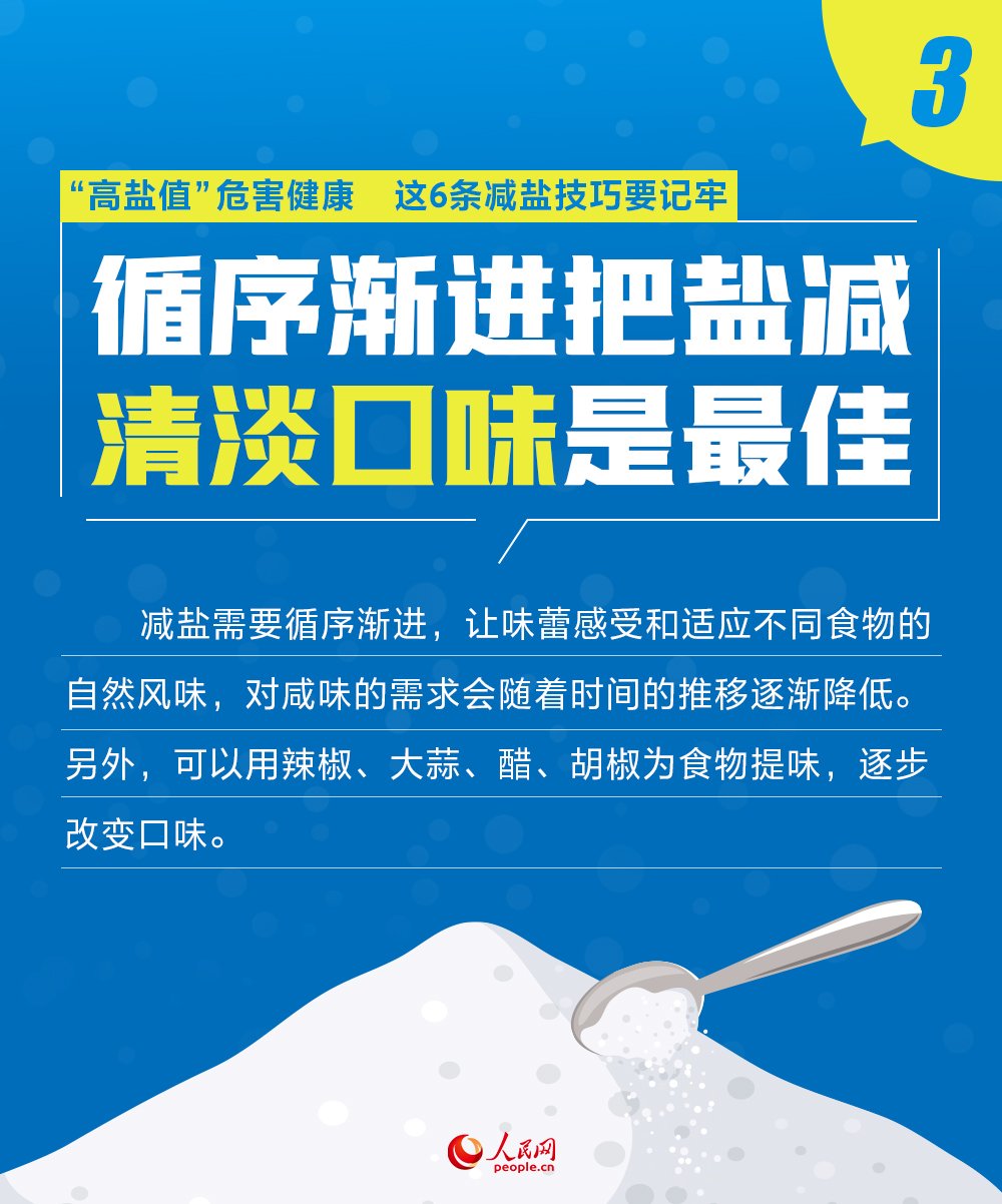 每年9月15日所在的第三周是“915”减盐周。减盐是一件关乎每个人健康的大事。盐的主要成分是氯化钠。高钠摄入作为高血压的重要诱因,会使心脑血管疾病发病与死亡的风险升高,增加脑卒中、冠心病、心血管疾病的死亡风险。同时,高钠饮食还可能增加慢性肾脏病、骨质疏松、胃癌、老年人认知障碍等其他疾病风险。吉林大学白求恩第一医院心血管内科副主任王宇石在接受人民网记者采访时提示,别让“高盐值”成为你的“健康杀手”,这6条减盐技巧要记牢。