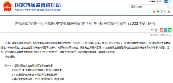 《通告》称,近期,国家药监局组织对江西知恩堂实业有限公司、金发拉比妇婴童用品股份有限公司、广东康百纳生物科技有限公司、暨研医药生物科技(广州)有限公司等4家化妆品生产企业进行了飞行检查。经查,发现上述企业违反了《化妆品监督管理条例》《化妆品生产质量管理规范》等有关规定。上述企业已对存在的问题予以确认。