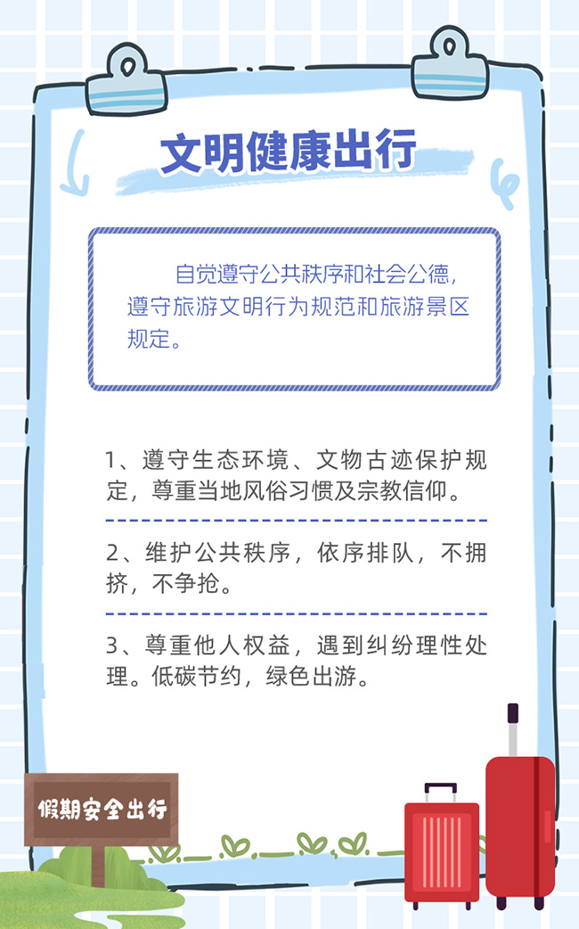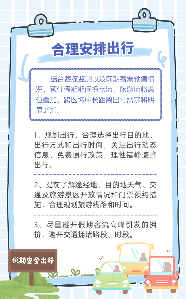 编者按:今年的中秋、国庆“两节”假期长达8天,让大家的出行热情格外高涨。近日,全国各地陆续迎来出行高峰,假期外出游玩、走亲访友,一定要做好充分准备、注意出行安全。这份提示请收好!