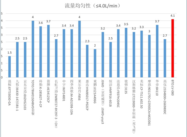 在不同试验压力下,流量值变化越小,花洒的流量均匀性越好。合理控制流量均匀性,对提升产品的舒适度和节水能力至关重要。本次比较试验的30款样品中,仅有1款样品标称BTO LV-080的流量均匀性未达到国家标准要求的≤4.0L/min。