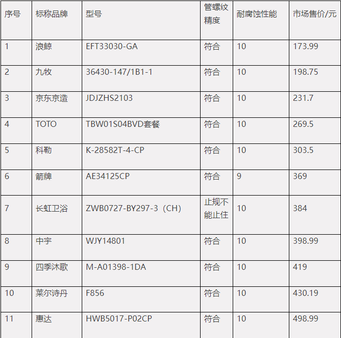 套装花洒的管螺纹精度及耐腐蚀性能与样品单价对比表。图片来源:中消协