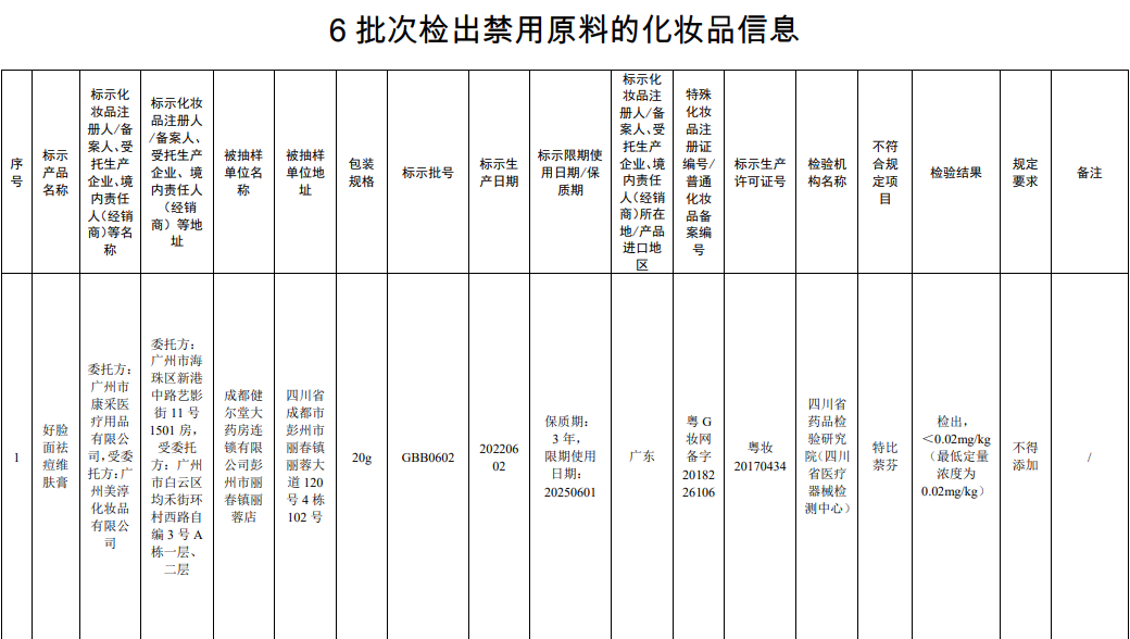 人民网北京1月9日电 (记者孙红丽)国家药监局近日发布通告,在2023年国家化妆品抽样检验工作中,经四川省药品检验研究院等单位检验,产品标签标示委托方为广州市康采医疗用品有限公司、受托方为广州美淳化妆品有限公司生产的好脸面祛痘维肤膏等6批次化妆品不符合规定,检出《化妆品安全技术规范(2015年版)》中规定的禁用原料。