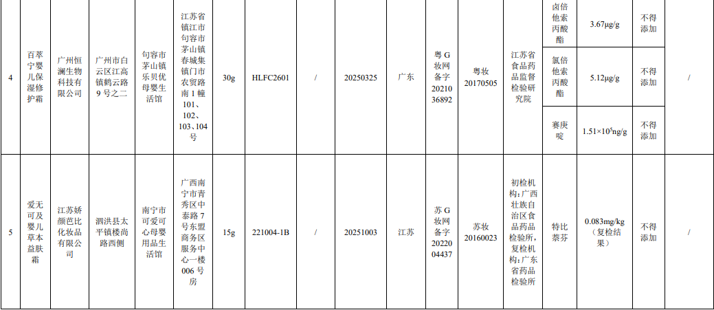 记者注意到,这6批次化妆品中还出现了婴童用品。其中,产品标签标示为广州恒澜生物科技有限公司生产的百萃宁婴儿保湿修护霜检出不得添加的卤倍他索丙酸酯、氯倍他索丙酸酯、赛庚啶。