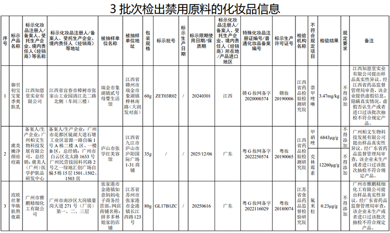 国家药监局:御贝初宝宝夏季爽肤乳等3批次化妆品检出禁用原料