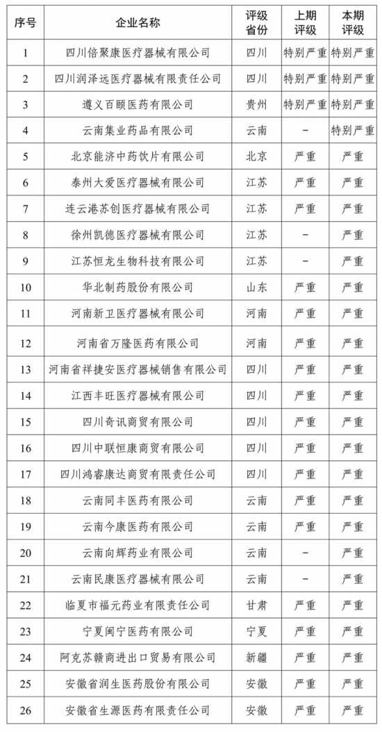 4家评级为“特别严重”的医药企业分别为四川倍聚康医疗器械有限公司、四川润泽远医疗器械有限责任公司、遵义百颐医药有限公司、云南集业药品有限公司。22家评级为“严重”的医药企业包括北京能济中药饮品有限公司、泰州大爱医疗器械有限公司、连云港苏创医疗器械有限公司等。