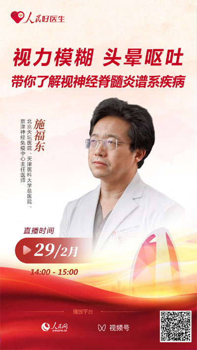 对于这种罕见的疾病,我们当前有哪些治疗方法?如何进行预防?2024年2月29日14:00-15:00,“人民好医生”客户端将邀请北京天坛医院、天津医科大学总医院、京津神经免疫中心主任医师施福东来到演播室,就视神经脊髓炎谱系疾病的相关内容进行分享,欢迎您收看!