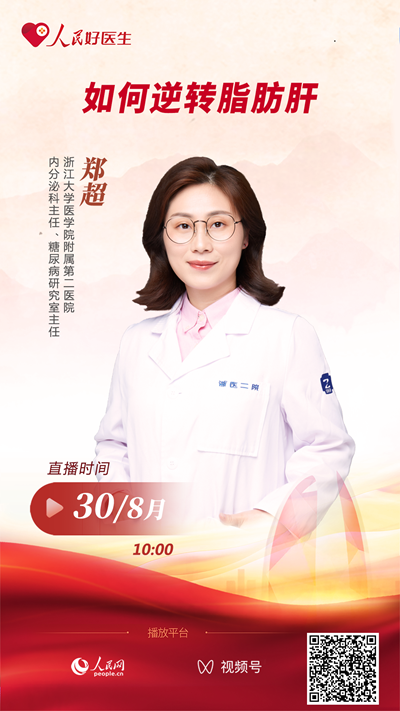 8月30日10:00,浙江大学医学院附属第二医院内分泌科主任、糖尿病研究室主任郑超作客“人民好医生”直播间,深入探讨脂肪肝成因、危害、诊断方法、治疗策略以及预防措施,帮助大家更好地了解脂肪肝,掌握科学的预防和治疗方法,从而远离脂肪肝的困扰,欢迎届时收看。