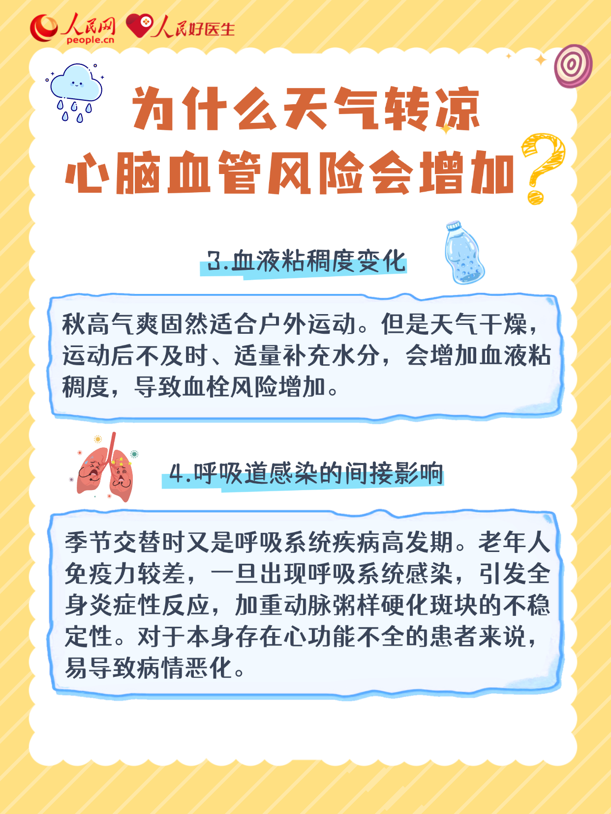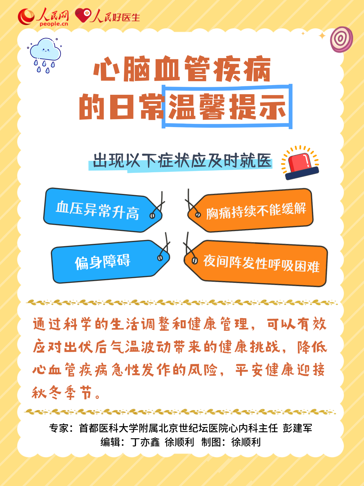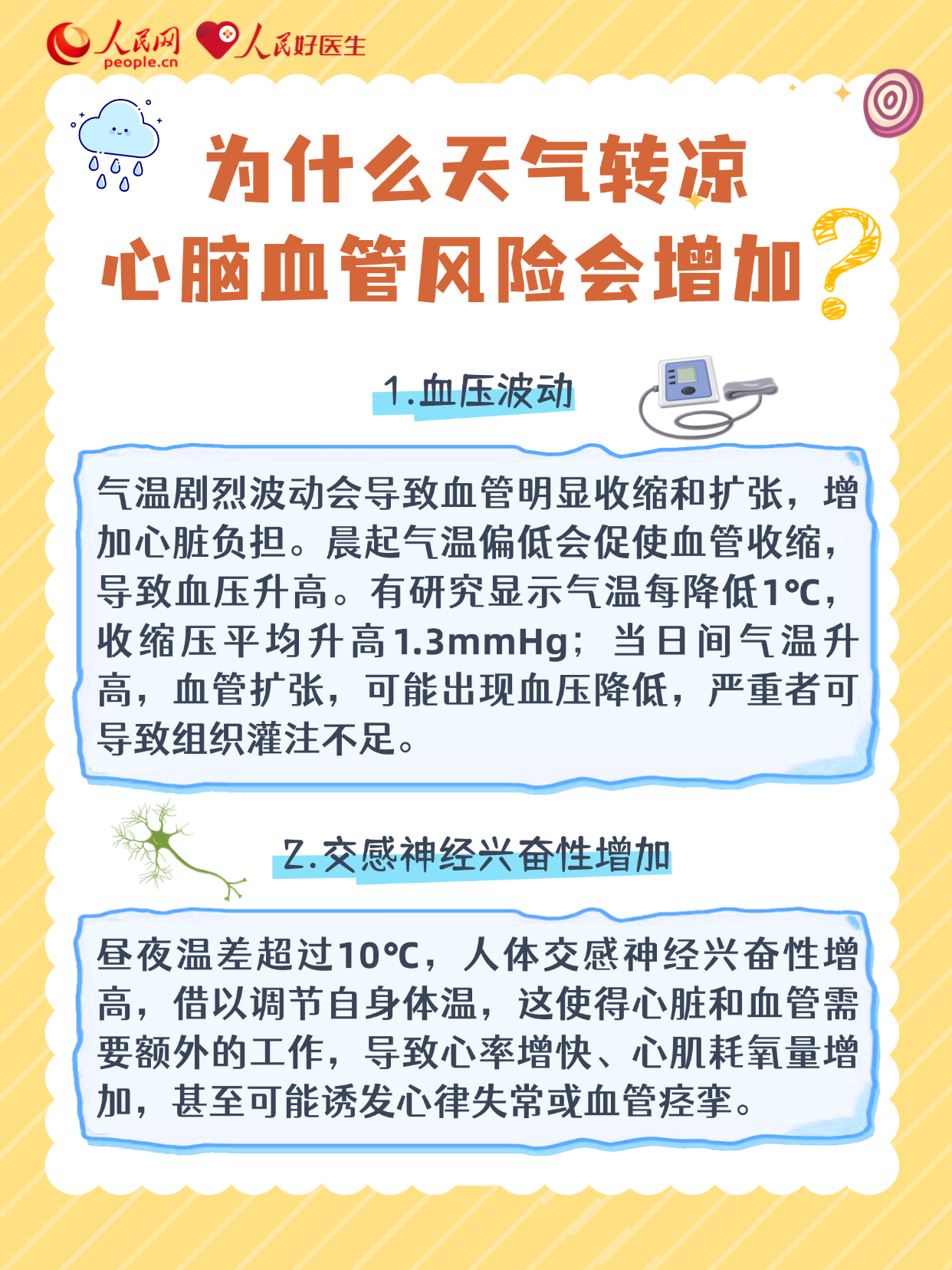 222眼下正值夏秋季节更替,尤其处暑后秋意明显,昼夜温差逐渐变大。其实,血管最怕“一冷一热”的刺激,在这个时节,高血压、心梗、中风风险显著上升。对于心脑血管疾病,有哪些预防措施?出现哪些情况要及时就医?