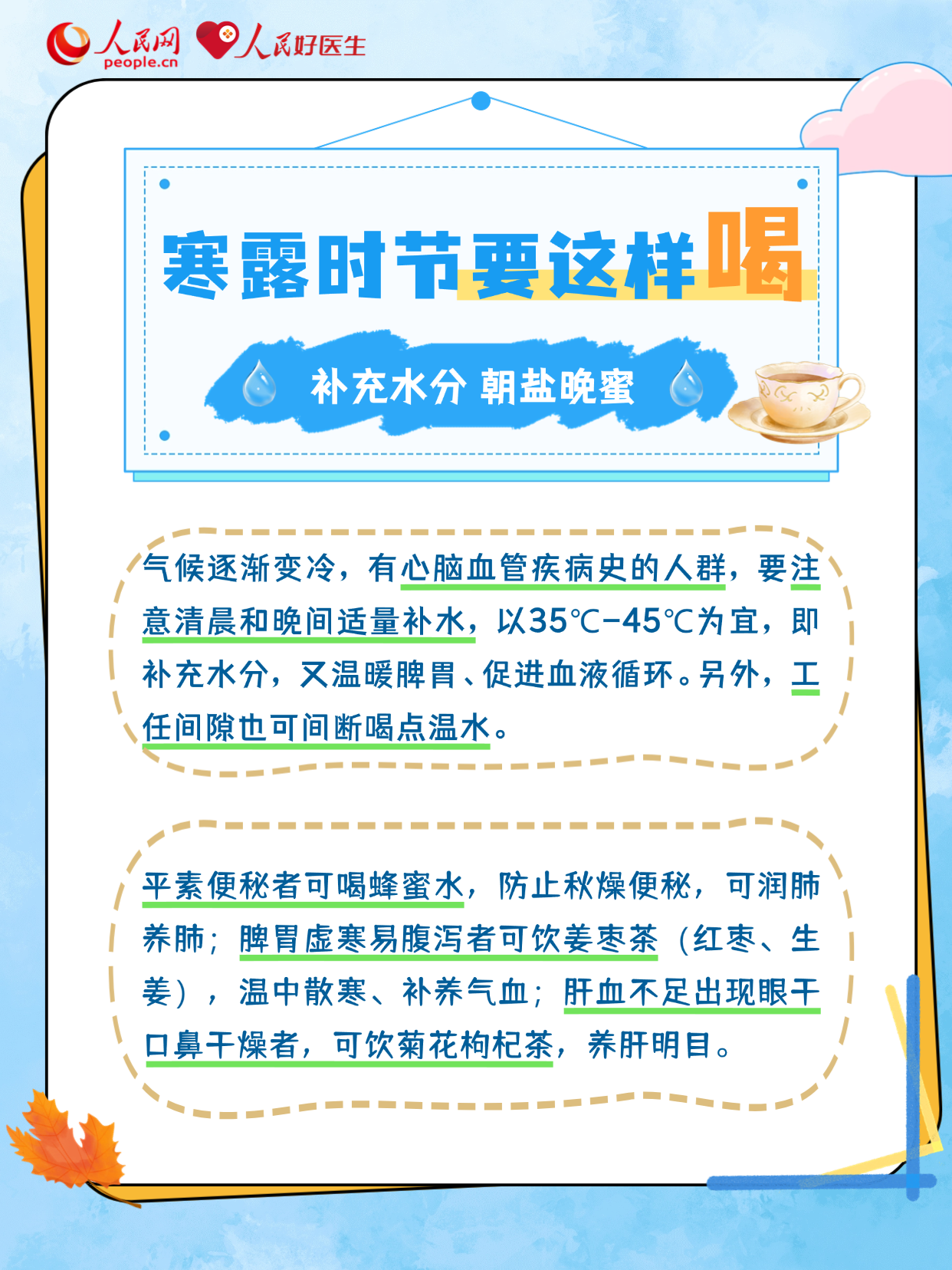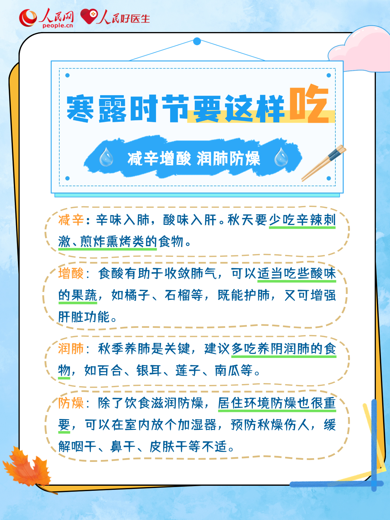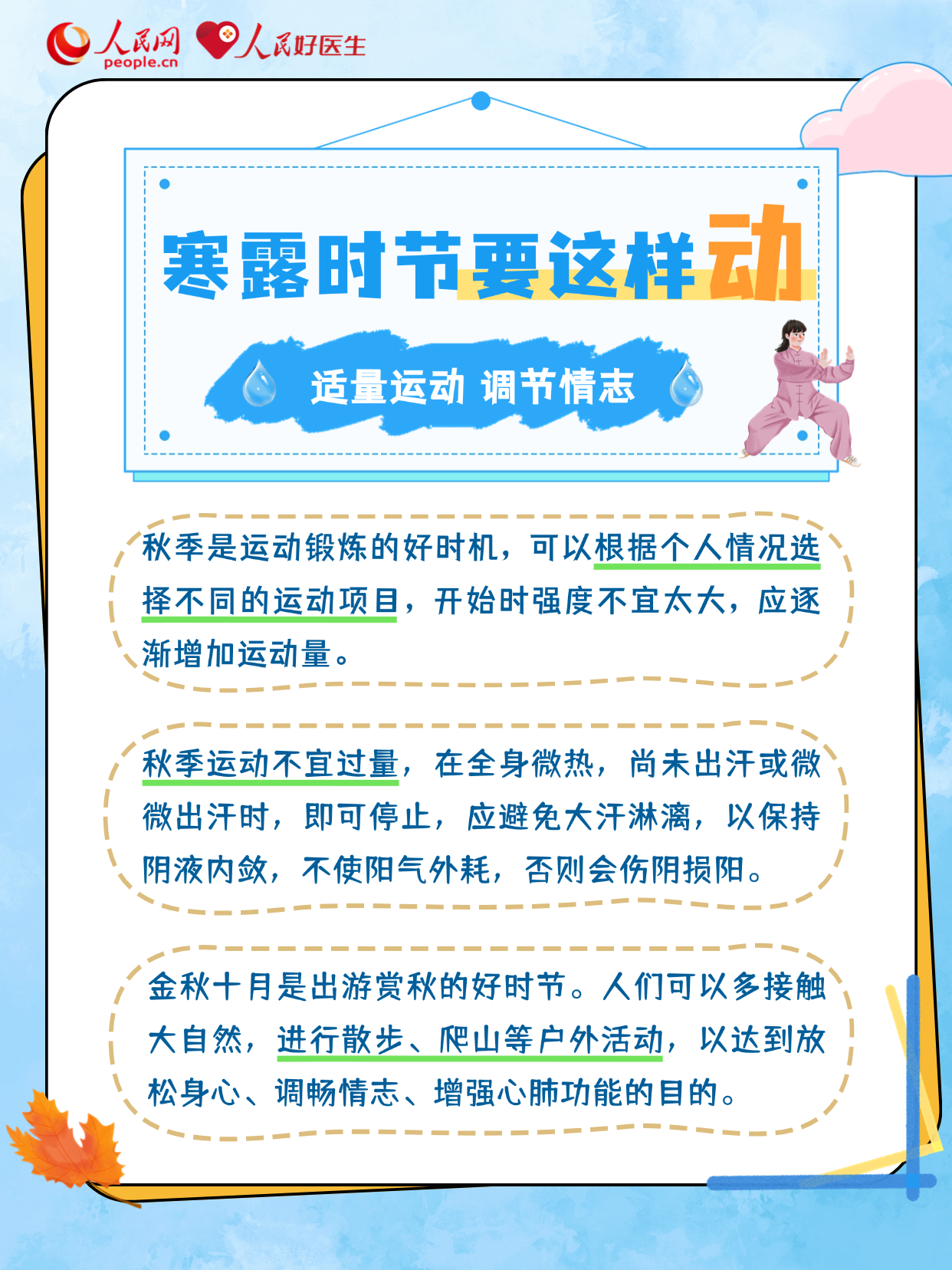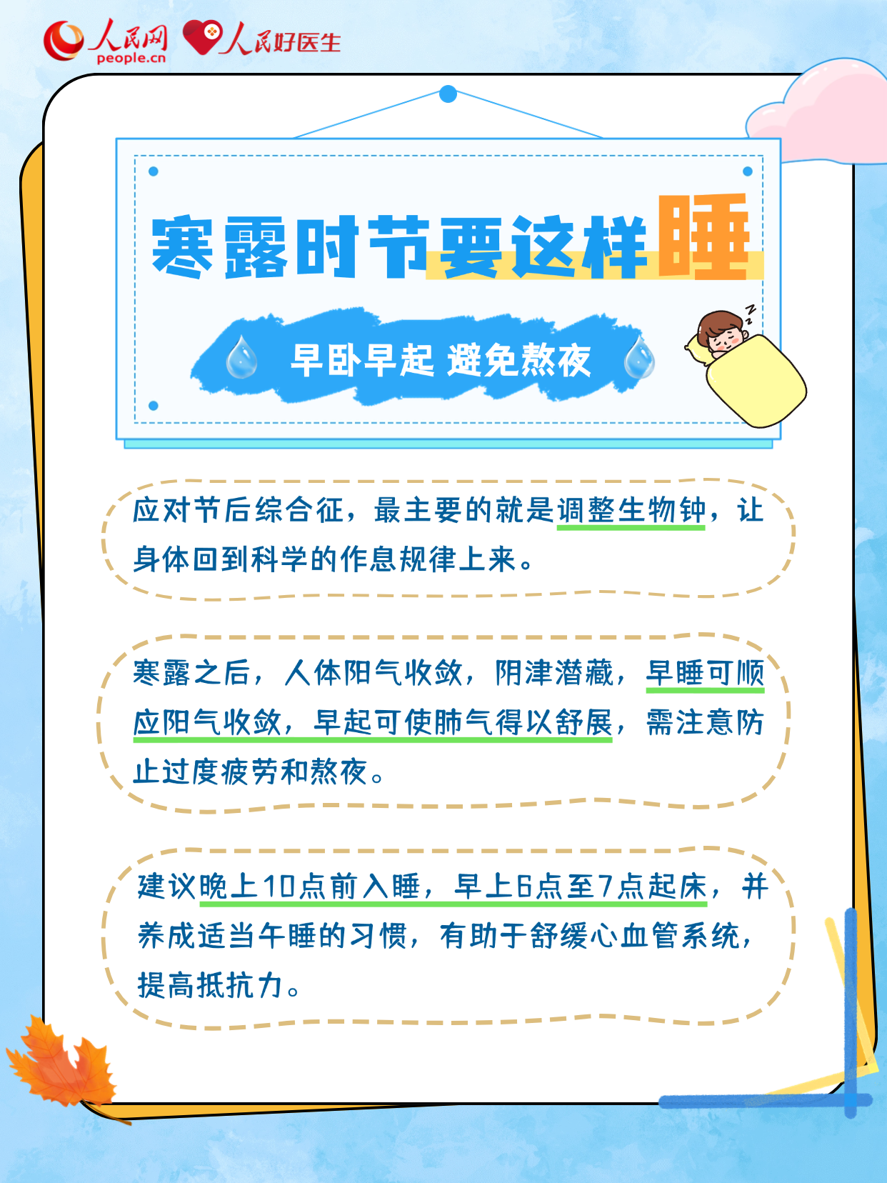 寒露如约而至,标志着深秋的到来,气温持续下降,昼夜温差增大,自然界中的阳气渐收,阴气渐盛。多数人因假日期间,睡眠及饮食规律被打乱,常表现出周身困乏、肠胃不适甚至恶心、阵发性眩晕、焦虑、睡眠差等症状。寒露时节养生应注意哪些要点?